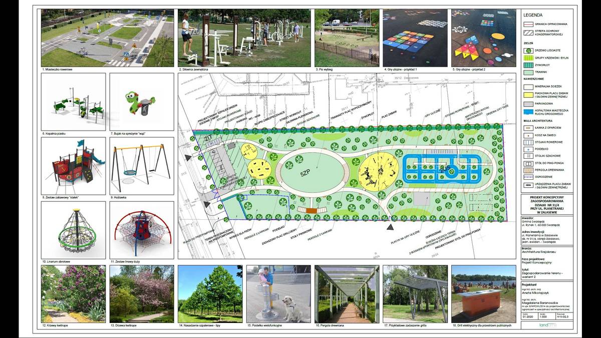 Budowa parku (możliwość modułowego wykonania prac w zależności od kosztów): -Postawienie siłowni zewnętrznej dla dorosłych,-Postawienie street workout dla młodzieży,-Wydzielenie terenu na wybieg dla psów,-Postawienie masztu z kamerą,-Budowa 10 miejsc parkingowych,-Postawienie ławek, ławostołów i grilli-Przygotowanie terenu do wybudowania ścieżek rowerowych i ich budowa,-Przygotowanie terenu oraz posianie trawy i nasadzenia krzewów, drzew-Postawienie znaków drogowych, sygnalizatorów.