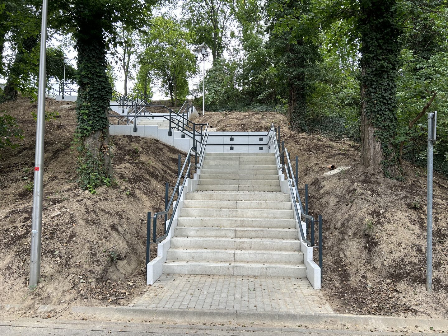 Zejście skonstruowane jest w dużej części z płyt chodnikowych I kostki brukowej. Każdy z traktów podzielony jest na odrębne sekcje składające się z  kilkunastu stopni. W znacznej części schody wykonane są z płyt chodnikowych, natomiast końcowa część schodów wykonana jest z kostki brukowej, ale są bardzo niebezpieczne z uwagi na zbyt wąski rozmiar szerokości stopnic. Poręcze przy schodach są wykonane z rur stalowych. Całość konstrukcji jest przestarzała i podniszczona wieloletnim użytkowaniem. Usytuowane przy schodach, zaniedbane kwietniki, przewiduje się do likwidacji. W zamian proponuje się nasadzenia drobnych wieloletnich niskich krzewinek. Przy miejscu siedzącym, widokowym zakłada się zamontowanie kosza do odpadów.
